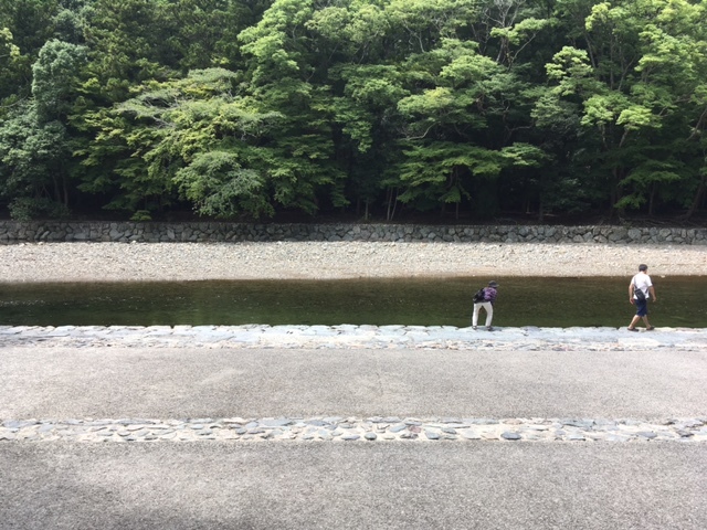 伊勢神宮のワンシーン。 素材や色が変わり、高さの変化があって、固体か液体か、 という物質の状態の違いがあって、 重力や風で運動を伴う素材が混ざり合うことで、境界の強弱を肌で感じることができる。 伊勢神宮は自分が作ってみたい建築の要素で溢れています。