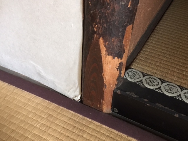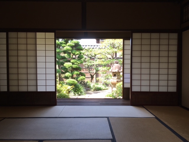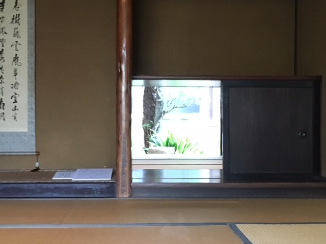 松阪市にある商人の家を見学。 個人的にすごくおもしろかったのは床の間の横にあいた開口部でした。 床の間横の扉を開けると奥の部屋の先にある庭と繋がって、景色が見え風が通るように出来ています。 魅せるだけでなく、実用もしっかり確保するところが商人の家らしくて良いですね。 反対の部屋から見ても同じように庭が見えるようになっています。 和室の床柱にはきれいなたけのこ面が。 たたみと重ならないようこんなふうに床柱をカットしたそうです。