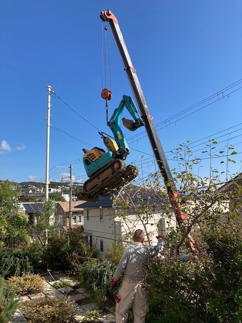 ハナレの掘削でシャベルをレッカーで吊って搬出。