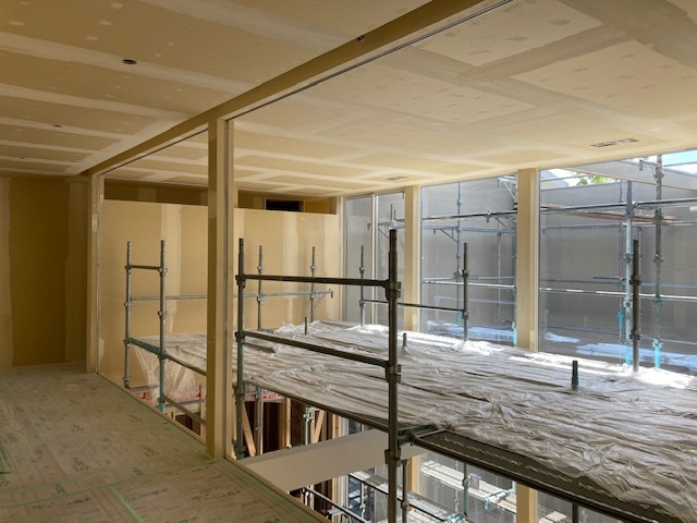 吹抜けや中庭との一体感がとても良い感じになってきた。