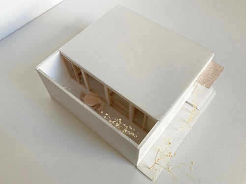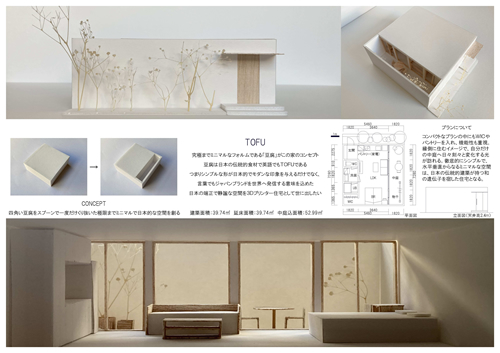 3Dプリンター住宅コンペの2等案。日本の伝統的食材である豆腐をイメージした直方体を、スプーンで一回くり抜いただけのシンプルでミニマルなコートハウス。豆腐は英語でもTOFUである事から、形態だけでなく言葉の面でもジャパンブランドを世界に発信するという意味を込めた。